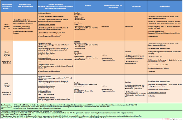 In welcher der drei Inzidenzstufen sich die einzelnen Kreise und Städte in NRW befinden, wird regelmäßig auf den Seiten des Gesundheitsministeriums www.mags.nrw veröffentlicht. Die in drei Inzidenzstufen geltenden Regeln für den Sport hat der Landessportbund NRW in einer Tabelle für Sie zusammengefasst: