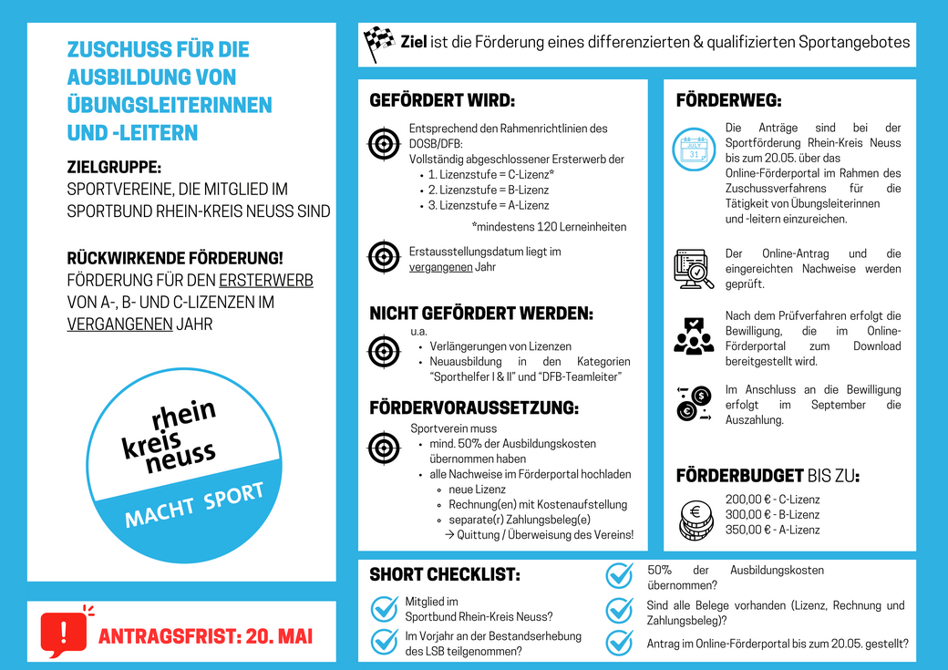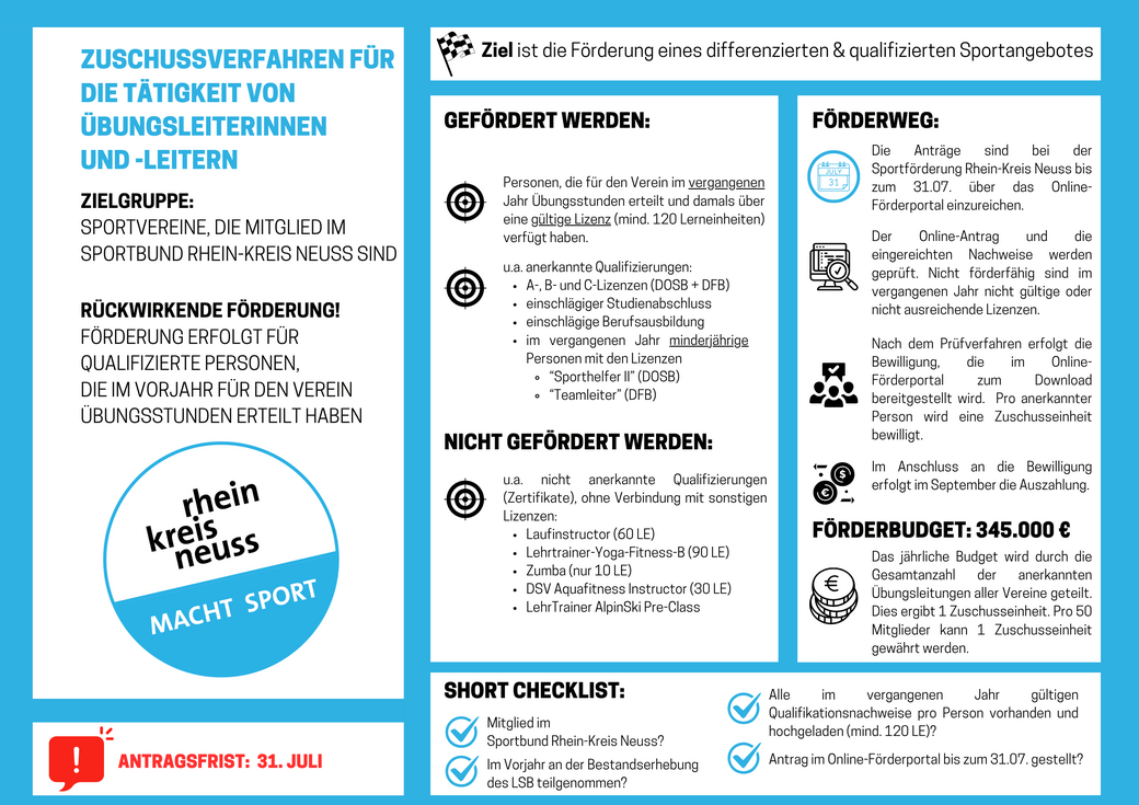Der Rhein-Kreis Neuss fördert neben dem LSB NRW die Tätigkeit von lizenzierten Übungsleiterinnen und -leitern in den Sportvereinen zur Unterstützung eines qualifizierten Sportangebotes.