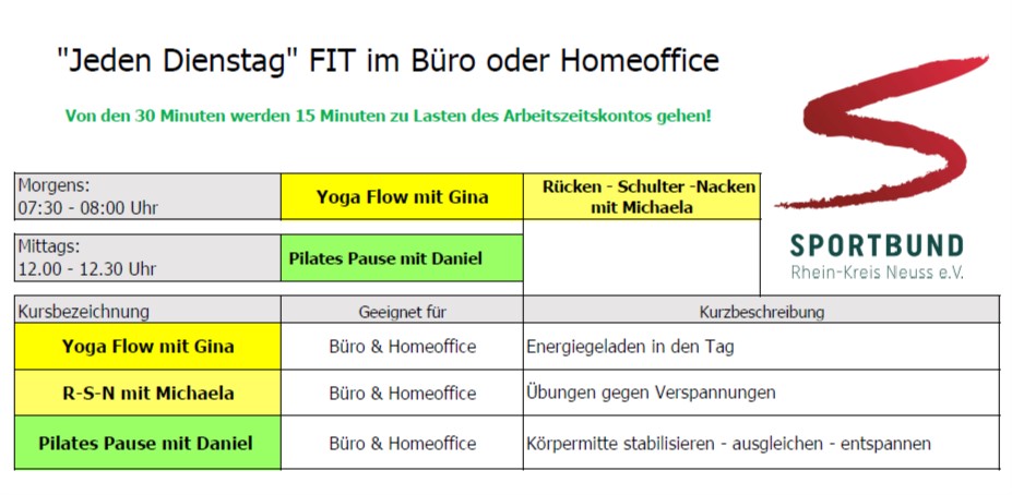 der Dienstag wird der neue Bewegungstag im Rhein-Kreis Neuss. Wie Sie per Rundmail bereits erfahren haben, startet die Kreisverwaltung des Rhein-Kreis Neuss in Kooperation mit dem Sportbund des Rhein-Kreis Neuss im April eine digitale betriebliche Gesundheitsmaßnahme - kostenlos für Sie! Und es kommt noch besser: Die Hälfte einer Einheit findet im Rahmen Ihrer Arbeitszeit statt. Sie bleiben eingestempelt und im Nachgang erfolgt eine Korrektur des Arbeitszeitkontos. (Für die Abwicklung hinsichtlich der Zeiterfassung fragen wir im Anmeldeformular Ihre RKN-Nummer ab)